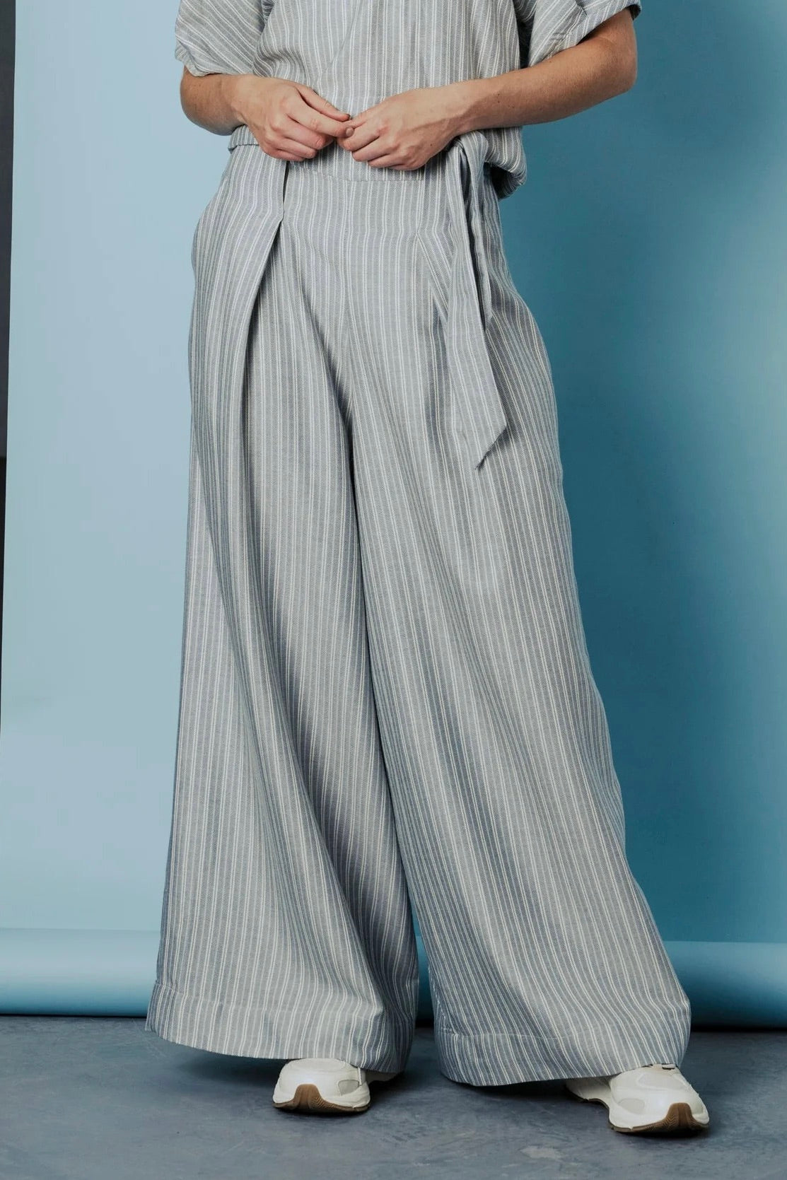 Crafted from a French herringbone cotton-viscose blend, the fabric is soft with subtle structure and a smooth, refined hand. It drapes with ease while maintaining its shape, creating movement without collapse. A fine pinstripe adds quiet definition to the surface.