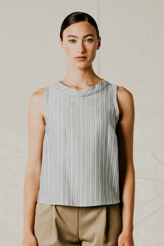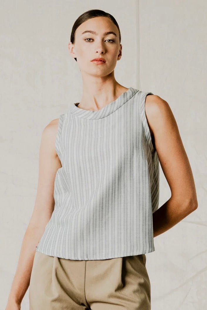 The design features pleated back detailing and a layered construction, creating dynamic movement. Cut to sit above the waist, the top offers a balanced, figure-flattering proportion.