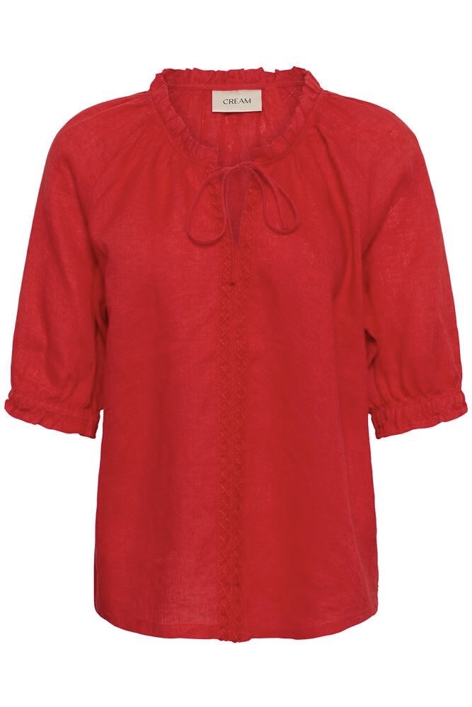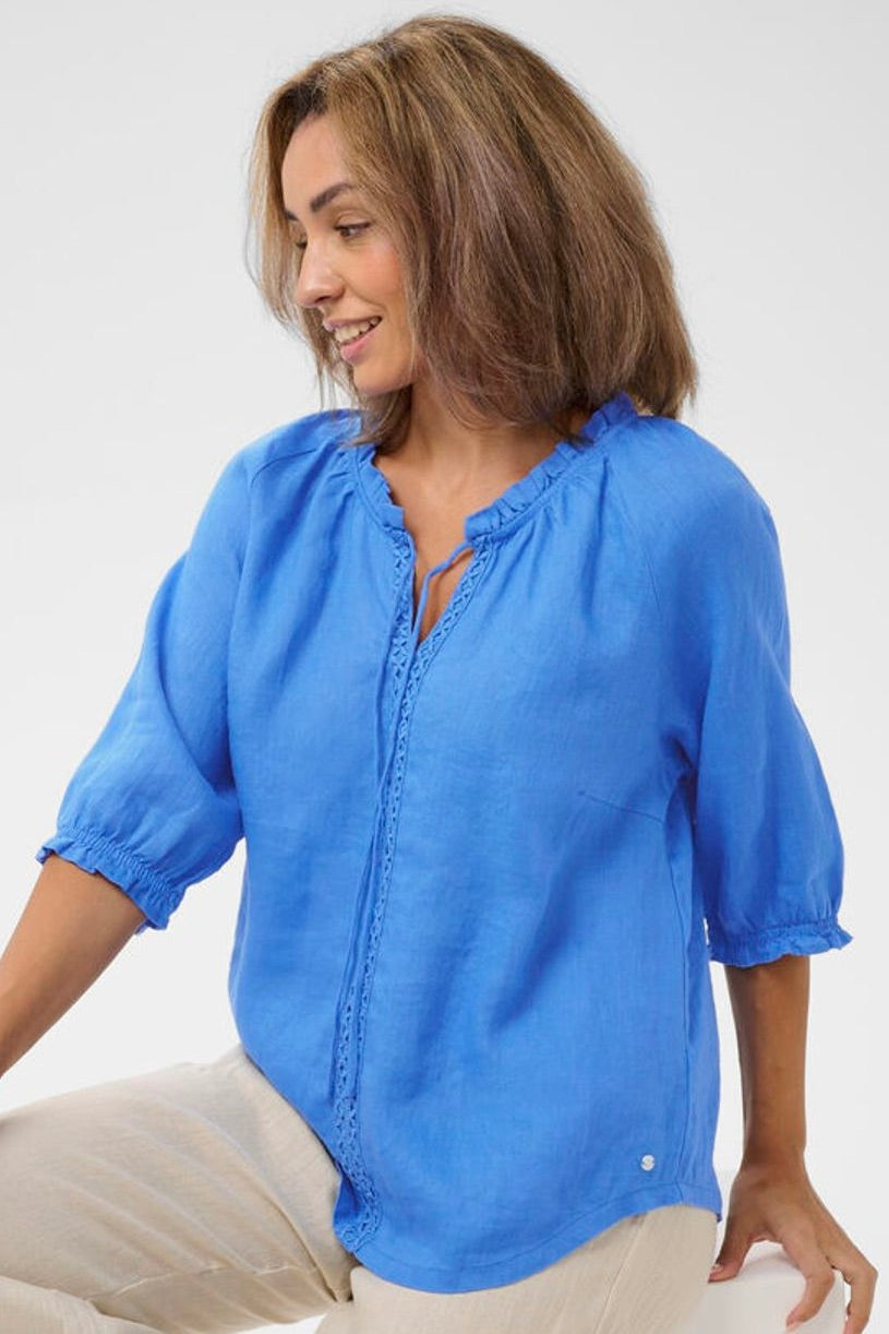 A lovely linen blouse in beautiful colours, featuring a crochet and tie detail, with elbow length sleeves. Pair perfectly with the Bellis Linen Pants.
