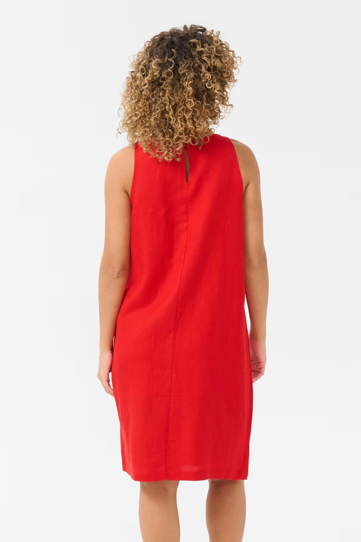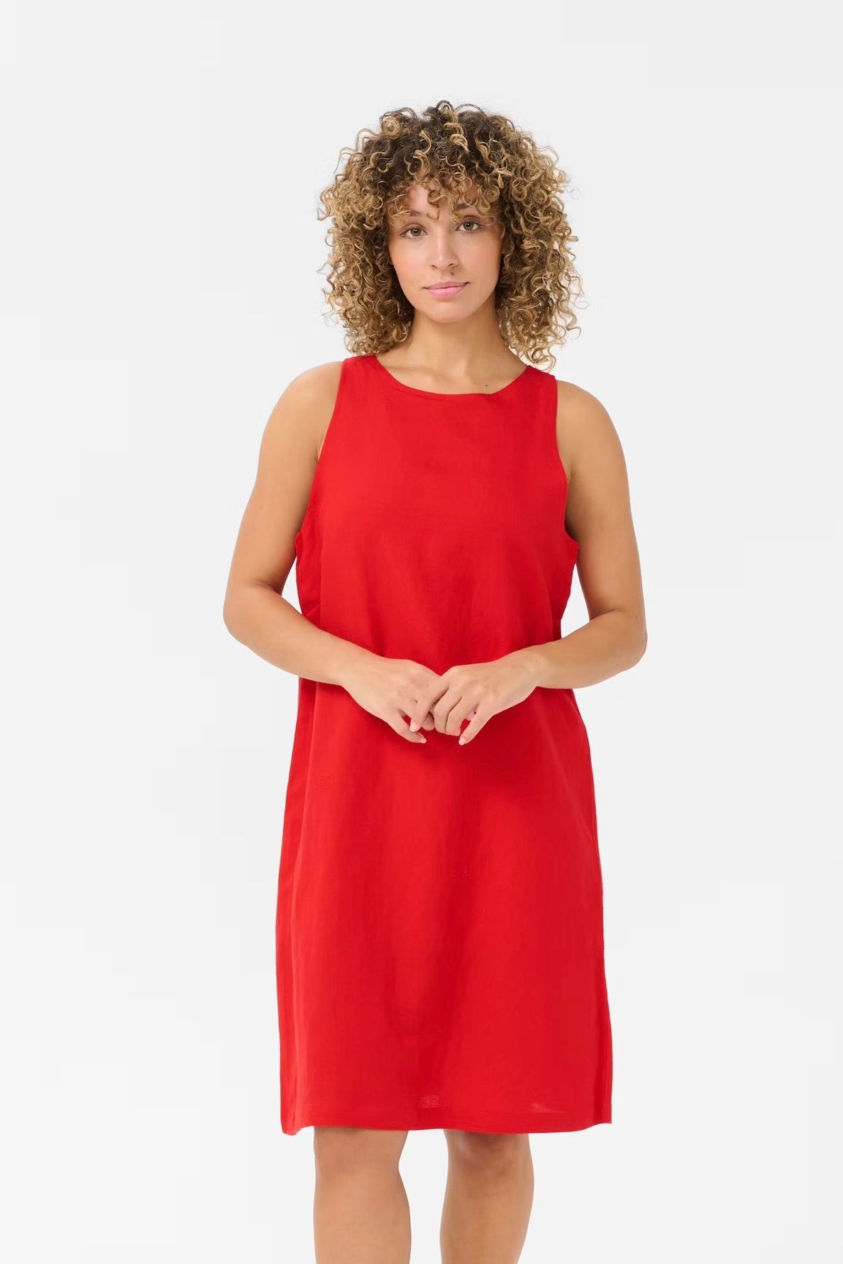 This sleeveless linen shift dress offers a relaxed, knee-length fit with a clean round neckline and minimalist design. Made from lightweight fabric, it ensures comfort and ease of movement for everyday wear. The model is 170 cm tall and is wearing a size 36.