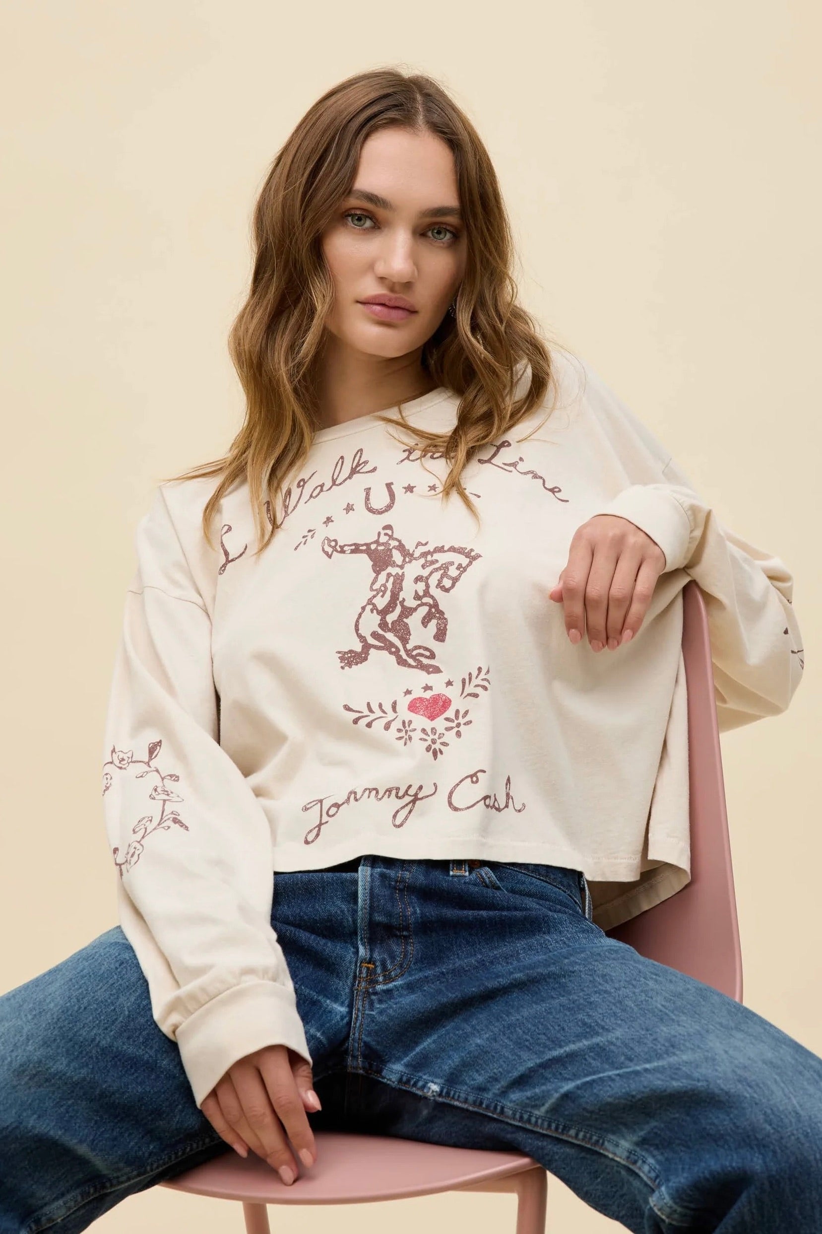 The legendary Johnny Cash and the echo of his charting track I Walk the Line hit in a boxy fit long sleeved tee.