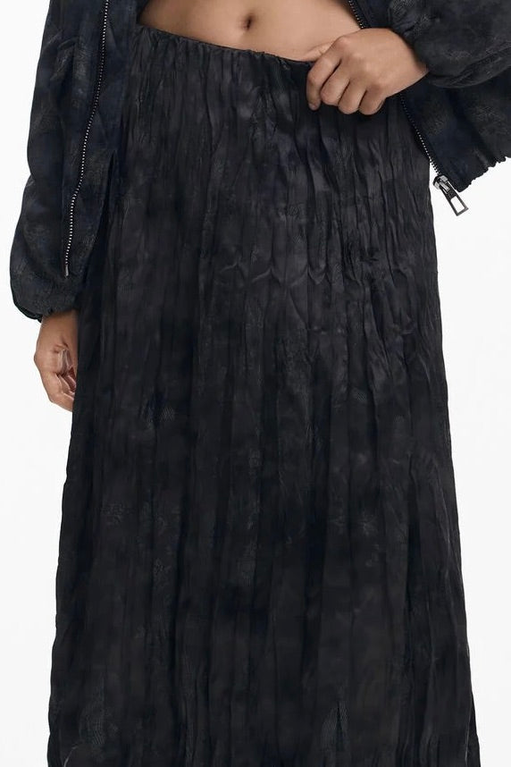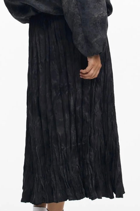 Midi skirt made of stretchy fabric with pleats and dark floral print with oriental inspiration. Flattering fit and beautiful dressed up or with sneakers!