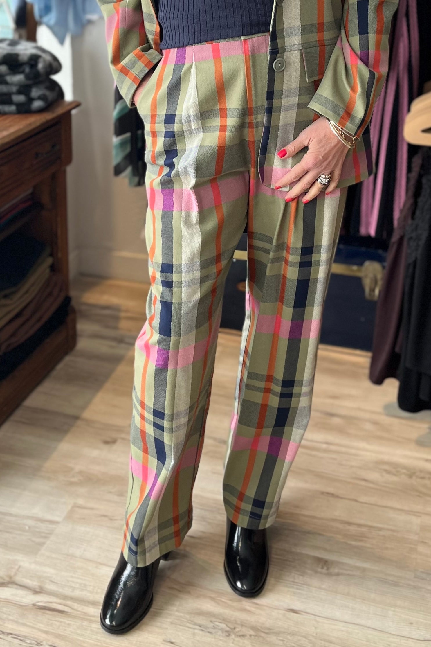 Fabulous tartan trousers with a waistband, a fly, and buttons at the front, as well as elastic at the back for optimal comfort. They are embellished with two patch pockets at the back and two side pockets for a practical and modern touch.