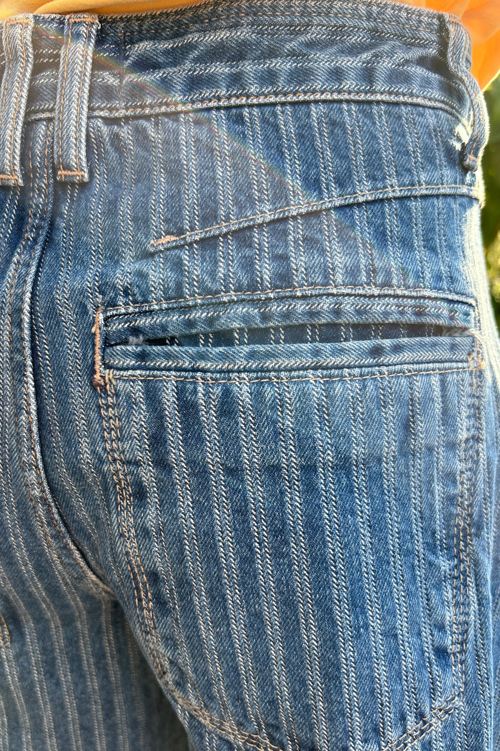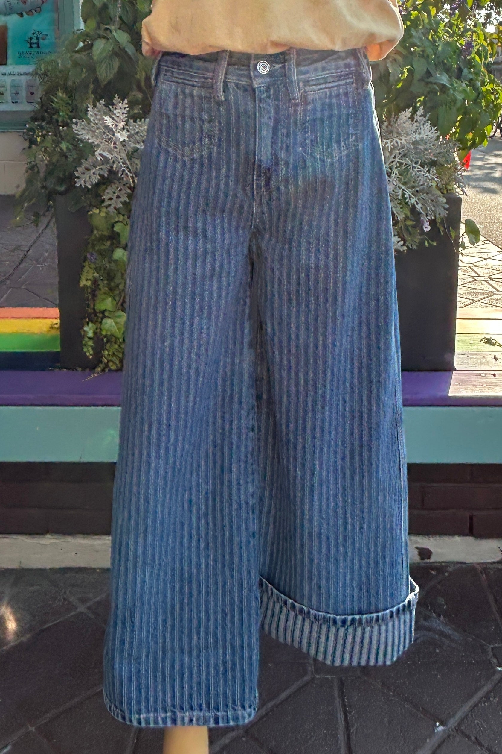Jeans that look as good with sneakers as they do with ballet flats. Zip fly and button closure, five-pocket design, washed stripe fabrication, cuffed hemline. Mid-rise, wide-leg silhouette with cropped inseam. Cuff can be untacked to wear full length.