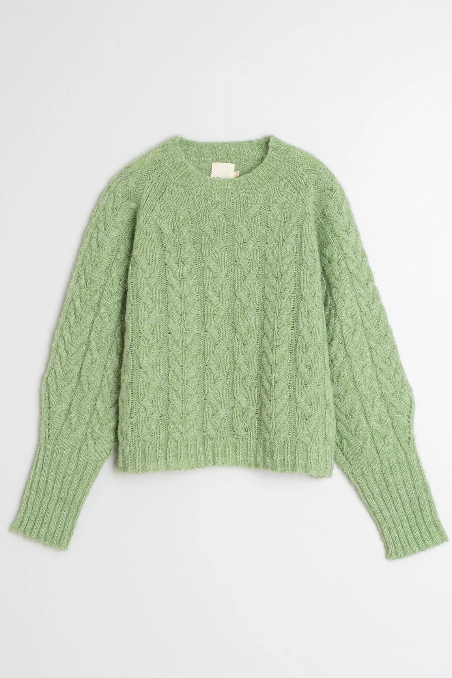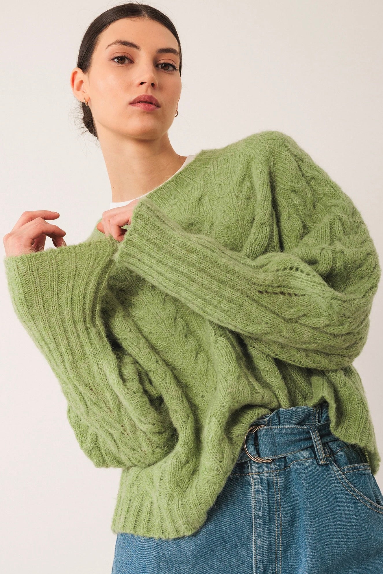 This braided knit sweater with alpaca will be one of your favorites from the collection. It's very trendy because it's cropped and loose.