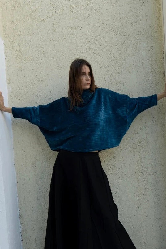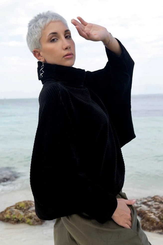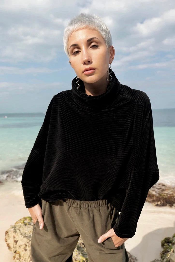 An oversized sweater in luxurious ribbed velvet, offering a cozy oversized fit and elegant chimney neckline. Fabulous colours! One size fits all.