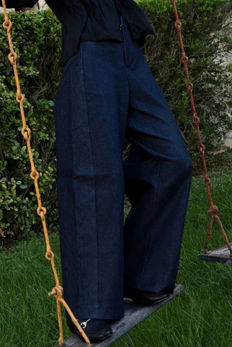 Super flattering on all sizes, high waisted, versatile cotton twill/denim trousers. They fear back pockets and an off-centre seam for added style.