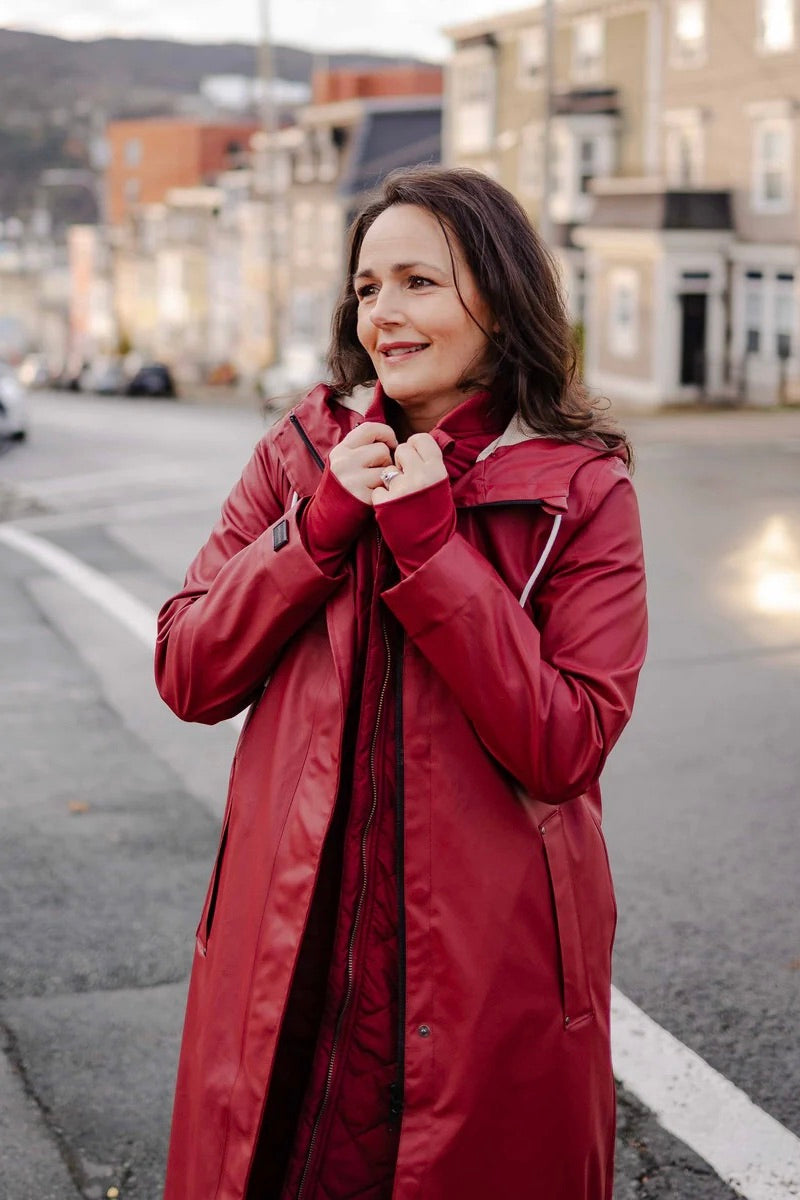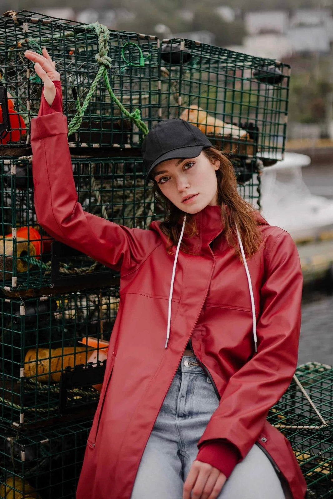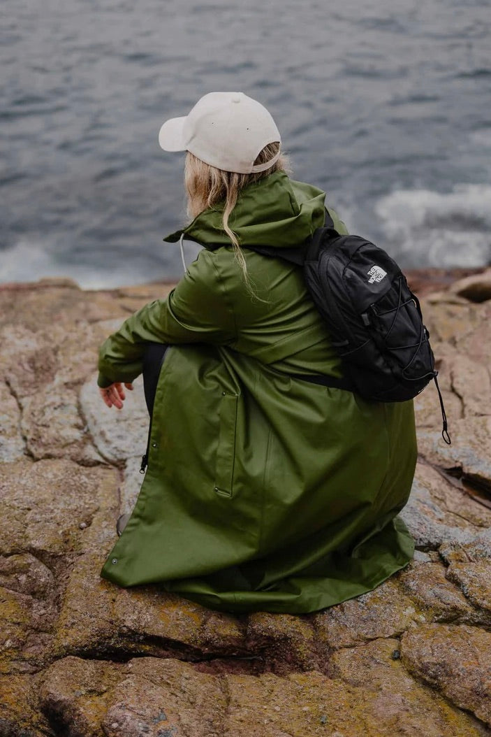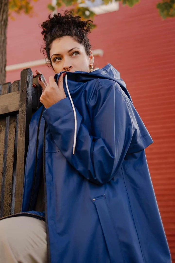 City chic meets outdoor practicality! A shorter version of the full-length Mernini raincoat, The Petite offers an A-line silhouette with ample room for outfit layering. This traditional, unlined design incorporates modern features such as water-resistant wrist warmers and a convenient magnetic front closure. Meticulously crafted, the mernini raincoat is built to withstand the unrelenting power of the North Atlantic wind and rain, making it essential for every strong woman.