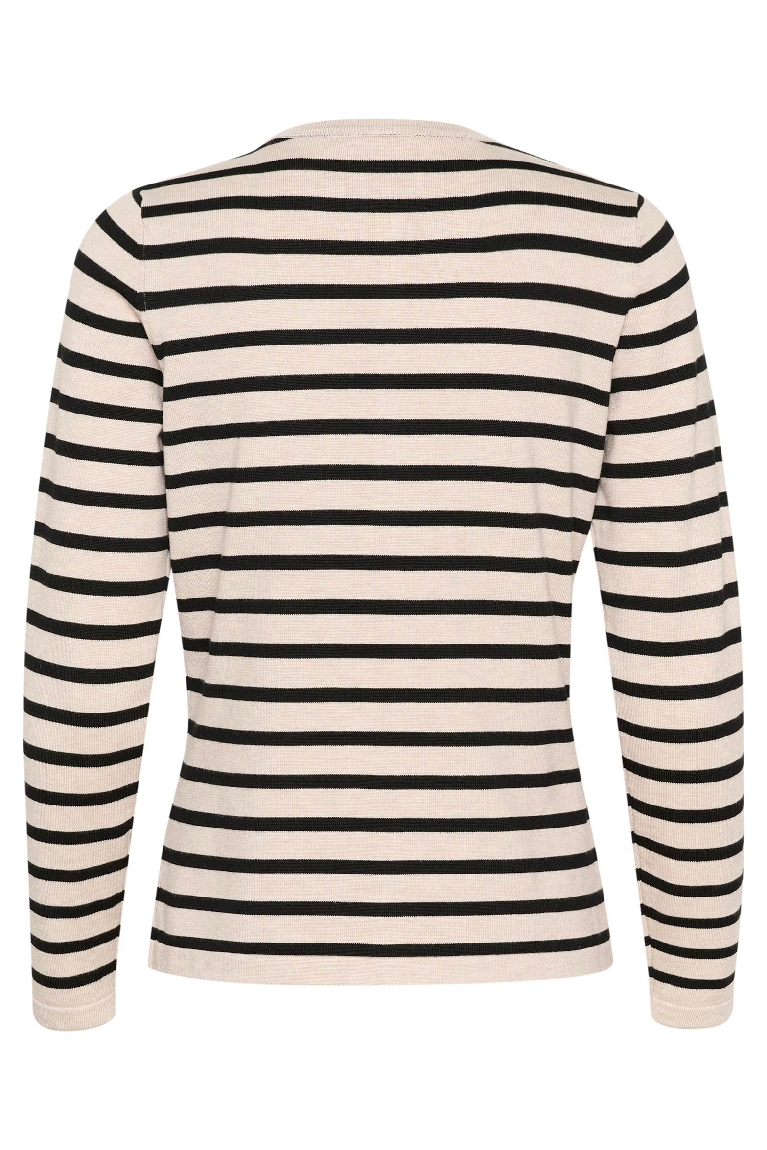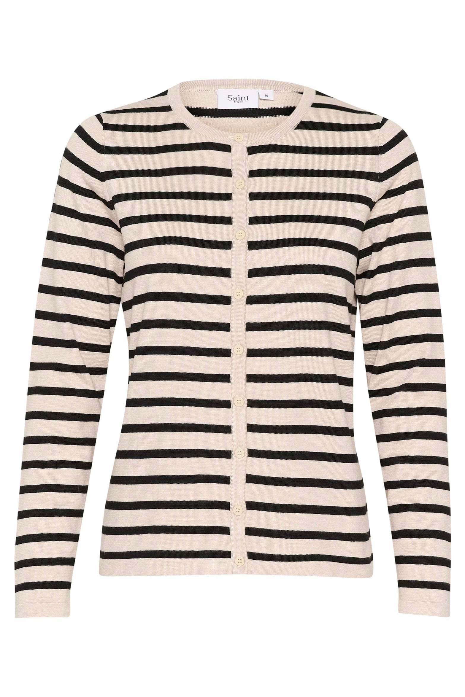 This striped cardigan features a classic round neckline and a button-down front. Its soft knit fabric and timeless pattern make it an ideal layering piece for any season. Black and ecru stripe.