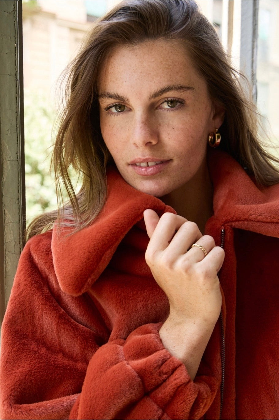 A stunning rust coloured bomber jacket, made in extra soft plush fabric. The wide collar, puffed sleeves and elasticized hem add a modern and relaxed feel. Perfect for casual looks and dressy occasions!